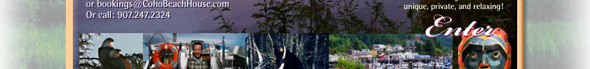 | Situated right on the waterfront, Coho Beach House one of Southeast Alaska's favorite vacation rentals is nestled on a point of land with its own private, shoal beach cove overlooking the Tongass Narrows near the town of Ketchikan on the southwest coast of Revillagigedo Island. At Coho Beach House, you'll enjoy gorgeous Alaskan sunsets year-around from the wrap around deck and picture view windows, while vacationing in the lap of luxury! Coho Beach House features 2 bedrooms each with a queen size bed, and a queen-size sofa sleeper in the living room, 1 bath, a full kitchen with all the modern conveniences, dining room, living room, and more. Coho Beach House is perfect for everyone... young, old, and in between, the family, romantic getaways, adventure groups boating, fishing & hunting and, of course... for honeymooners! This cozy vacation rental is Alaskan living at its finest unique, private, and oh, so relaxing! Coho Beach House is located right in the middle of some of the hottest attractions in and around Ketchikan! The beach house is situated at the entrance to Ward Cove, just 5 minutes from downtown Ketchikan and the infamous gold-rush era Old Town shopping and dining district. Coho is also close to Totem Park and Ward Lake with its Freshwater fishing, picnic grounds, and trail system. The beach house is also just a few minutes from local tours, boat rentals, guides and outfitters, fishing and floatplane charters. Click here for area attraction information. To book your short term vacation rental, please fill out the Reservation Request Form and submit it today. For more information about our rental terms, conditions, policy, and privacy staement, click here. Thank you for visiting www.cohobeachhouse.com. We look forward to having you as guests in the very near future! |